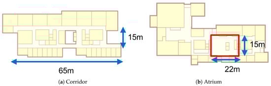 Experiments were conducted on both a corridor and an atrium, which represent as one-dimensional environment and a two-dimensional environment. The corridor and the atrium have sizes 15 m × 65 m, and 15 m × 22 m as depicted in Figure 8. The overall test environments of these places are listed on Table 1.