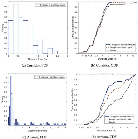 The overall positioning performance is summarized in Table 3. The average positioning error of the corridor (0.76 m) was superior to that of the atrium (2.30 m) because of the significant classification performance difference. For the same reason, from the cumulative distribution functions (CDF) on Figure 9b,d, we observed positioning accuracy enhancement as the number of features increased. The distance between ground truth and corrected magnetic landmarks was 0.8 m on average. Therefore, most of distance errors were located within 2 m, as shown in probability density functions (PDF) on Figure 9a,c. On the contrary, the distance interval between landmarks prediction was 4.52 m for the corridor, and 4.13 m for the atrium. Because people usually walk at the speed of 1.4 m/s [], the system estimates locations every 3 to 4 s.
