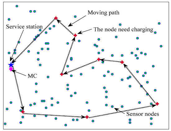 We assume that N rechargeable sensor nodes randomly distributed in a flat square area, as shown in Figure 1. The maximum battery capacity of the nodes is denoted as . The sensor nodes are equipped with a wireless power receiver to harvest energy from MC. The MC with maximum capacity is a wireless energy transmission device and move on the flat ground at a constant speed v. It will return to the service station for energy supplement when the energy is insufficient.