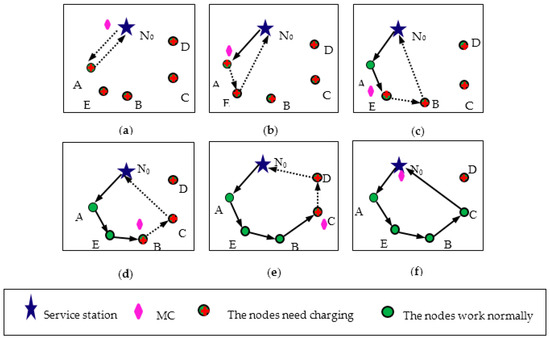 Charging path construction process. (a)–(d) The node with the smallest weight is chosen as the next charging node to build the virtual charging path successfully. (e) The fifth charging node selection and virtual path construction failure. (f) MC returns to the starting point for energy replenishment of and prepares for the next round of charging.