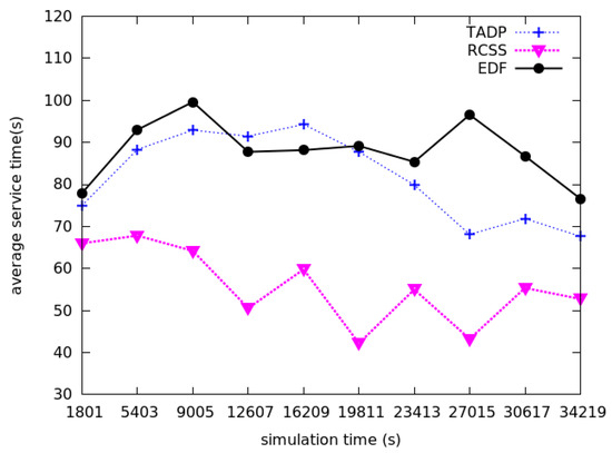The comparison of average service time among RCSS, TADP and EDF.