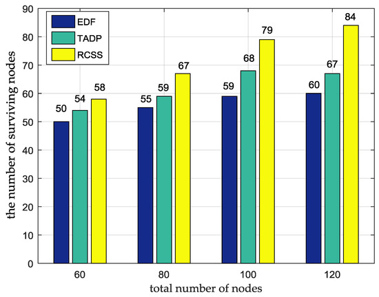 The comparison of the number of surviving nodes among RCSS, TADP and EDF.