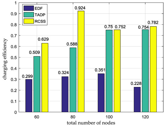 The comparison of charging efficiency among RCSS, TADP and EDF.