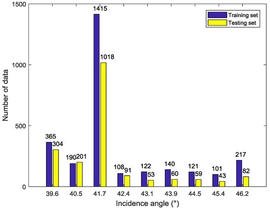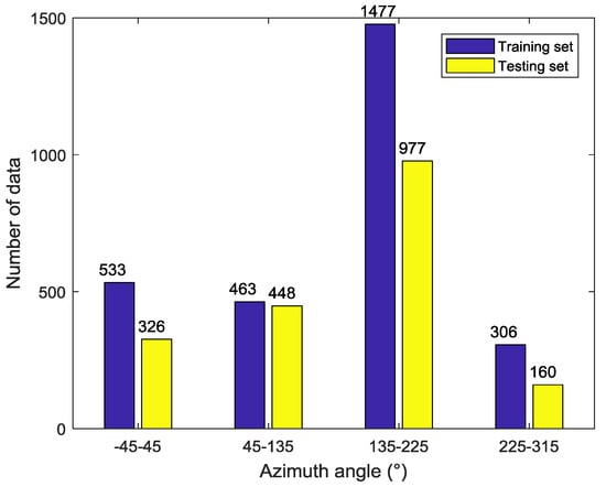 After the above two preprocessing processes, a total of 4690 GF-3 Wave Mode images are selected from 6355 images. The results show that the small incidence angle (in-angle < 36°) co-pol data is almost saturated, according to the xml product description. Therefore, the analyzed incidence angle of this paper is only from 39° to 47°. The detail information of data distribution is shown in the Figure 1, Figure 2 and Figure 3 below. To guarantee the validity of experiment, this experiment divides the whole data into training and testing set randomly first. Then, a small amount of data is adjusted artificially so that both sets can cover full range of incidence angles, azimuth angles and wind speeds. Finally, 2779 match-ups are chosen as training set and other 1911 samples as testing set.