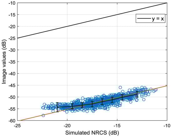 As shown in Equation (1), the NRCS in dB is linear with the calibration constant. It provides a possibility for using the wind fields and GMFs to retrieve the calibration constant. In [53], it is found that CMOD4 has a better performance than CMOD5 under low to moderate wind speed. The wind speed range used in this paper is mainly focused on low to moderate wind speeds. Therefore, this experiment uses CMOD4 to obtain simulated VV-polarized NRCS. The difference between simulated NRCS and the value extracted directly from the corresponding image is the stimulated calibration constant. This method requires plentiful fitted data to ensure the accuracy of results and each beam has their own calibration constant. Therefore, the match-up data of 41.7° incidence angle (beam 205) in the training set is used to verify the calibration method. To guarantee the reliability of the calibration method, this experiment only selects data with wind speed higher than 4 m/s [39]. Moreover, the distribution of wind speed and direction in the experimental data set also affects the calculation of calibration constant. Hence, we first split the training set into wind speed bins of size 2 m/s and azimuth bins of size 90°. Then, let each speed bin has roughly the same amount of data and filter data in each speed bin so that the distribution of azimuth angle is uniform. Finally, 901 uniform match-ups are obtained to implement the calibration method. Figure 4 shows the relationship between simulated NRCS by CMOD4 and values obtained directly from VV polarized images. The error bars of bin 2 dB are also plotted.