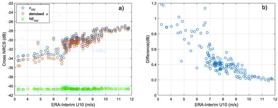 The cross-pol backscattering signal-to-noise ratio (SNR) of ocean surface is much weaker than co-pol signal. Therefore, it is necessary to compare cross-pol NRCS with the system noise floor before wind retrieval [36]. The Chinese Academy of Sciences Institute of Electronics provides a ground system processing technology for GF-3 satellite and can obtain the noise gain coefficient of Wave Mode. Due to the limited number of products with system noise gain coefficient, only 138 sets of beam 205 match-ups with noise floor are collected. Figure 5a,b show the HV-polarized NRCS as a function of ERA-Interim re-analysis wind speed and the difference between and which is removed noise floor, respectively.