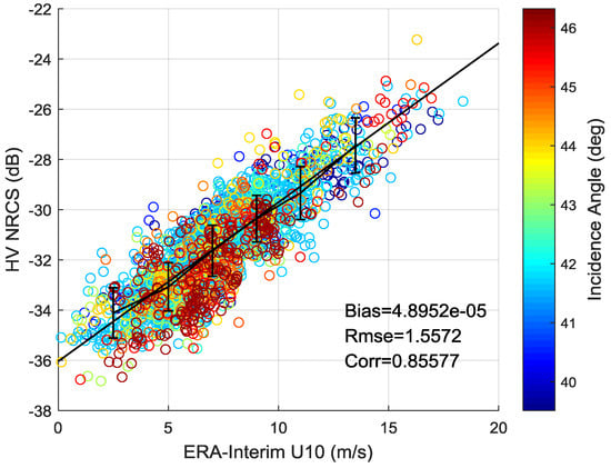 As illustrated in Figure 5a, the HV-polarized noise floor of beam 205 is about −40 dB. It is sufficiently low and the noise performance of GF-3 Wave Mode is better than RADARSAT-2 quad-polarization mode which has the noise floor of −36 dB [45]. Figure 5b shows that the noise floor has some effect on cross-pol signals at low wind speed (<10 m/s) and the difference between and denoised can be ignored at high wind speed. However, the number and distribution of noise floor is limited in this experiment. The noise floor of different beams may have some differences and without noise removed also shows a clear linear relationship with wind speed. Therefore, this experiment temporarily ignores the effect of noise floor. The relationship between the NRCS after calibration correction and wind speed is shown in Figure 6. Different colors represent different incidence angles. The errorbar of bin 2 m/s is also plotted. As shown in Figure 6, the is independent on incidence angle and exists obvious linear relationship with wind speed. The black solid line is obtained using a non-linear least-squares method, and the formulation is: