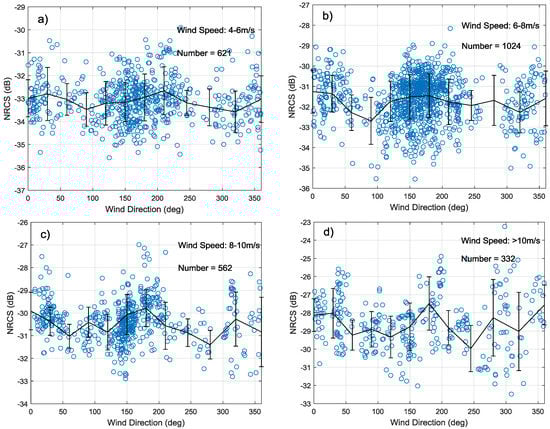 Relationship between cross-pol NRCS and azimuth angle at wind speed 4–6 m/s (a), 6–8 m/s (b), 8–10 m/s (c) and >10 m/s (d).