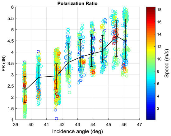 Figure 8 shows the relationship between PR and incidence angle as well as wind speed based on 2779 training data. Different colors represent the different wind speeds. The error bars of each incidence angle bin are also plotted. The PR rises rapidly with increasing incidence angle as in previous reports.