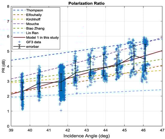 To evaluate the performance of two fitted PR models, we test the models in testing set and compare two models with different models in [27,45]. PR model proposed by Zhang in [27] is a function of incidence angle as well as wind speed and model fitted by Ren in [45] is dedicated to GF-3 QPSI and QPSII mode data.