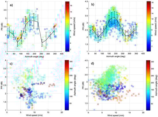 (a,b) represent the variation between PR and azimuth angle and different color shows different wind speed. (c,d) show the relationship between PR and wind speed. Different color represents different azimuth. (a,c) are at incidence angle 39.6°. (b,d) are at incidence angle 41.6°.