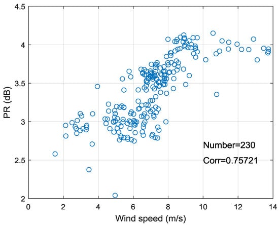 To give a more comprehensive PR analysis for GF-3 Wave Mode data, the relationship between PR and azimuth angle is also studied. It shows a similar characteristic described in [28]. The variation of PR with azimuth angle and wind speed is shown in Figure 10a–d at the incidence angle of 39.6° and 41.7° (beam 202 and 205). The error bars of bin 30° and 20° are plotted in Figure 10a,b respectively. Figure 10a,b show that there is an approximate cosine relationship between PR and azimuth angle like the characteristic between NRCS and azimuth angle. The maximum of PR is observed in downwind direction (), a secondary maximum is appeared in upwind direction () and the minimum values are in crosswind (). This is slightly different from NRCS, which appears maximum in upwind and secondary maximum value in downwind. In addition, Figure 10c,d show the PR tends to increase with the increase of wind speed (<10 m/s) in the downwind, while it is independent with wind speed in other wind direction. To more clearly analyze the variation of PR with wind speed in downwind, this experiment screens out beam 205 data with azimuth angle of , and the relationship between the PR and wind speed is plotted in Figure 11. The correlation coefficient (0.7572) between PR and wind speed illustrates that the PR is positively related to the wind speed in downwind.