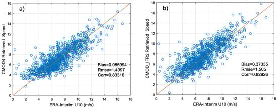 Based on the obtained calibration constant, this experiment uses GMFs to perform wind speed retrieval on beam 205 data of testing set. Figure 13a–d show the comparison between ERA-Interim wind speeds and retrieved wind speeds using CMOD4, CMOD_IFR2, CMOD5, CMOD5.N, respectively.