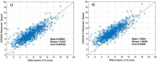 Comparison of ERA-Interim U10 with SAR-derived wind speeds which use CMOD4 (a), CMOD_IFR2 (b), CMOD5 (c) and CMOD5.N (d).