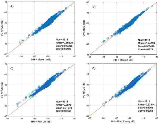 Figure 14a–d illustrate the comparison of four PR models. The abscissa of figure is retrieved NRCS by PR model and the ordinate is NRCS from SAR image in VV polarization. Figure 14 also show the root-mean-square error (RMSE), bias and correlation coefficient for each model. It is shown that two models fitted in this study are in better agreement with Wave Mode data. The bias of Model 1 and Model 2 is much lower than two other models. And Model 2 which considers the influence of wind direction has a smaller RMSE (0.443 dB) and larger correlation coefficient (0.98). In addition, Figure 14c shows the PR model proposed for GF-3 QPSI and QPSII mode cannot be used well in Wave Mode data. The retrieved NRCS is generally lower than observation. There may be two reasons for this result. First, the imaging bandwidth and system noise floor of two operating modes are different. These may affect the observation of NRCS. In addition, the PR model in Figure 14c is mainly fitted by data with incidence angles between 35°–38°, while PR models in this study are mainly applicable to data with incidence angles greater than 39°, due to the lack of data of small incidence angle.