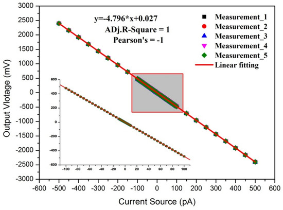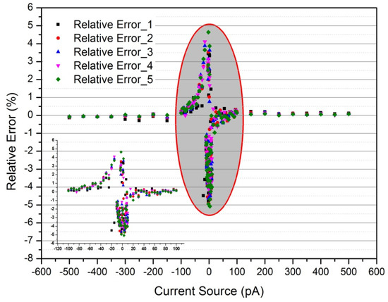 - Keithley. Low Level Measurements Handbook, 7th ed.; Keithley: Solon, OH, USA, 2014; pp. 2-55–2-62. [Google Scholar]