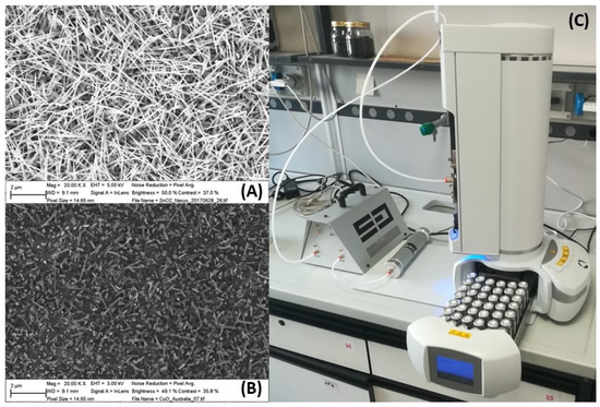 (A) SEM image of SnO2 nanowires. (B) SEM image of CuO nanowires. (C) Experimental setup formed by S3 and autosampler.