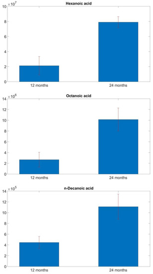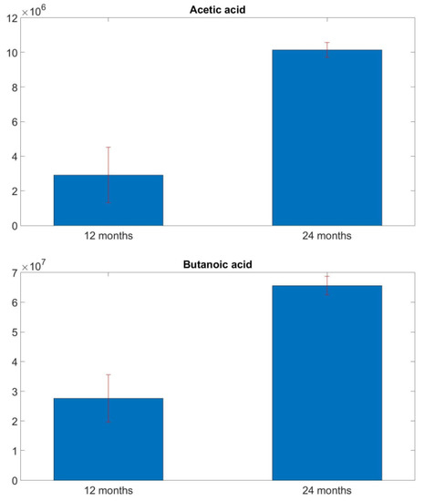 From the comparison between samples chromatograms, substantial differences were found. The main difference between 12-months and 24-months ripened grated PR lies in the amount of fatty acids that characterize this product. They are acetic acid, butanoic acid, hexanoic acid, octanoic acid, n-decanoic acid, and their presence is much greater in 24-months PR. In Figure 2, histograms for each of the aforementioned compounds are shown: results are presented in terms of mean ± standard deviation of the mean with an arbitrary unit. This result is widely confirmed in the literature. Indeed, it is well known that these fatty acids are the results of fermentation processes, especially in butter and seasoned cheese. Some studies revealed that the amount of acetic acid and butanoic acid doubles in the period between 12 and 24 months [51,52]. The same trend was observed in the other compounds, since biochemical processes that lead to their formation are very similar.