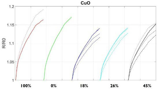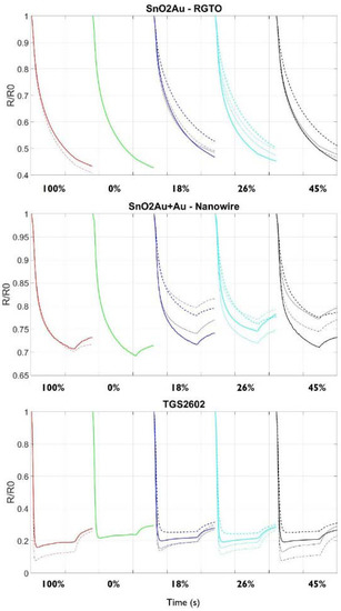 TSG2602 and SnO2Au+Au nanowires seem to be the best MOX to identify ripening and rind working process at fixed concentration, since minimum resistance varies mostly for samples with the same rind percentage. Conversely, CuO and SnO2Au (RGTO) responses are more useful to recognize “pure” samples (0% and 100% of rind) from mixtures, since in the first case ΔR is bigger.