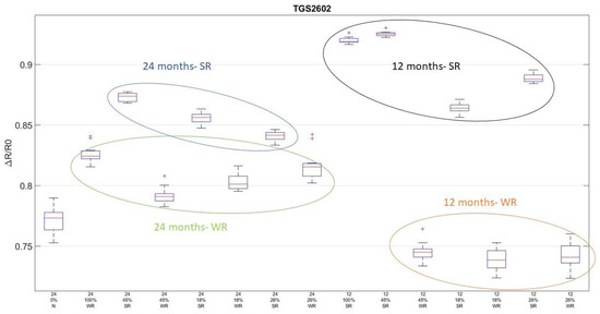 Boxplots of TGS2602 feature ΔR/R0. Four groups are highlighted: In blue, 24-months SR; in green, 24-months WR; in black, 12-months SR; and in orange, 12-months WR.