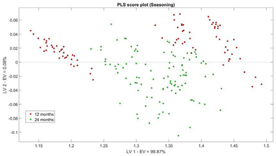 After checking the general sensors performances, JB-test was applied to the dataset. Only 4 of the eight parameters followed a normal distribution (p < 0.05); they correspond to the features extracted by the two tin oxide nanowires and RGTO sensors. This was the main reason for choosing PLS. In Figure 5, PLS score plot was made, considering the first two latent variables (LV) for a total explained variance equal to 99.95% (99.87% for LV1 and 0.08% for LV2). The plot measures are divided by seasoning degree. It can be observed that the 24-months class is in the central part of the graph, while the other one is divided in the left and right part.