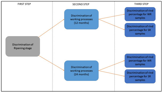 For this reason, classification techniques were used in a hierarchical way. In addition, another motive for this choice was to simplify classification models, since this is a 15-class problem. Hence, in the first step, classifiers were used to distinguish the seasoning degree; in a second step, for each ripening state the different working processes were discriminated; finally, ring percentage was taken into account. In Figure 6, a scheme of the steps is shown.