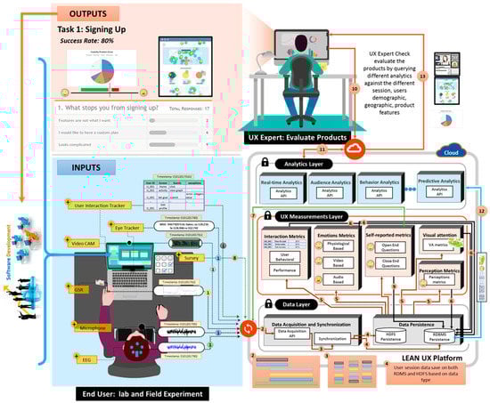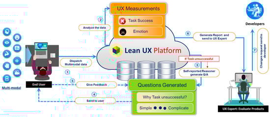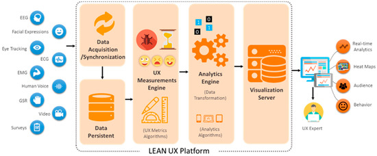 Our proposed platform is based on the “lean UX” [61], which incorporates product development through the continuous measurement of a so-called “learning loop” (build—measure—learn), as shown in Figure 1. The main focus of the proposed platform is measuring and learning (inferencing), both implicitly and explicitly, from the subject’s usage behaviors and emotional responses. Consequently, UX research can be simplified by incorporating the human behavior research [5,62].