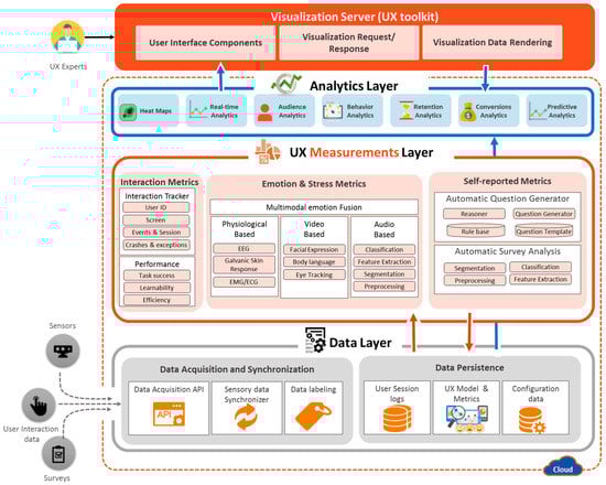 The platform is composed of four layers: the data layer (DL), UX measurement layer (UXML), analytics layer (AL), and visualization server (VS). The detailed architecture of the proposed platform is shown in Figure 3.