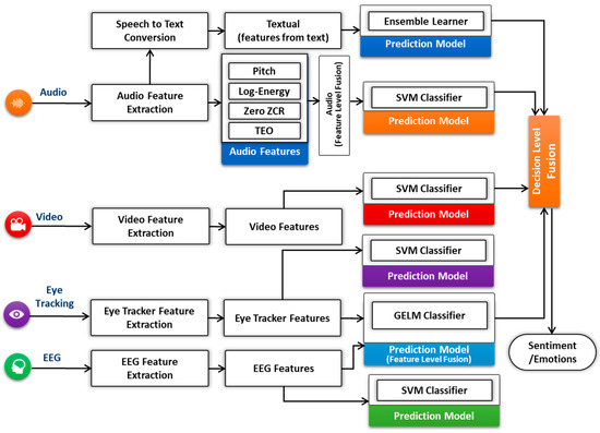 There are three different types of fusion level [76,77,78]: feature level, decision level, and hybrid level. Feature-level [79,80,81,82,83,84] is also known as early fusion, that fuses the features extracted from different modalities (e.g., audio, textual, EEG, and eye tracking) for prediction. Decision-level fusion [79,85] is called as late fusion, where the individual’s modalities classifier examined the features, gives the results, and then fuses the results to give a final decision. In feature-level, we combined the features of EEG and eye tracking (pupil size) for user sentiment recognition either positive, negative, or neutral. The combined feature vector has been used for the prediction classification. In decision-level fusion, we have employed the feature vector from each input modality and fed into individual classifier as shown in Figure 5. We have adopted the 10-fold cross-validation to estimate the performance of each recognizer. We have used the mean values of all prediction confidences score for prediction fusion. In our case, the rule-based approach has calculated the final label of the prediction as shown in the formula given below: