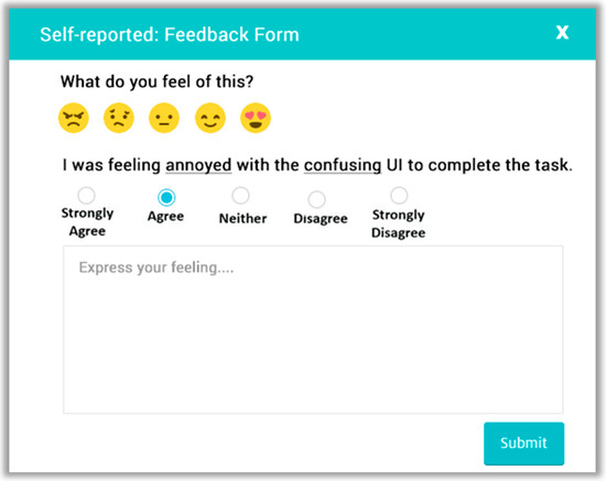 Additionally, the question generator adds a free text field, user emotions Likert scale emoticons as shown in Figure 6 and then sends it to the participants for obtaining the response. The obtained user’s response is persisted in the database for analysis.