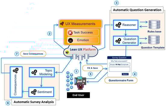 Self-reported metrics [35] deal with post-tasks that explicitly ask questions about the participant for information about their opinion and their interaction with the system, for example, overall interaction, ease of use, satisfaction, effectiveness, and efficacy. It consists of two main modules: automatic question generation and automatic survey analysis. Automatic question generation asks questions based on UX measurement information that triangulates [86] stated answers with biometric unconscious responses. The reasoner [87] component uses the UX measurement information as input data, which are quantified by emotion and stress metrics and interaction metric modules. Based on input facts, the reasoner fires the rules. The fired rules are passed to the question generator, which uses the predefined question templates to ask selective questions against the post-task performed by the participant.
