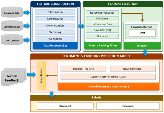 The workflow of sentiment and emotion analyzer is shown in Figure 8. The workflow consists of three main steps (a) Feature construction (b) Feature Extraction and Selection (c) Learning of prediction model. The details of these steps are described in the subsequent sections.