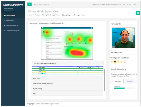 - Video-based Emotion Recognition: The video-based emotion recognition metric consists of two methods and sub-modules: facial expression analysis [41] and body language analysis. Automatic facial expression analysis (AFEA) plays an important role in producing deeper insights in human emotional reactions (valence), such as fear, happiness, sadness, surprise, anger, disgust, or neutrality. For AFEA, we used an inexpensive webcam to capture video of a participant in order to reduce the overall financial cost. Our developed AFEA first detects the face in a given video frame or image by applying the Viola Jones cascaded classifier algorithm. Second, different facial landmarks features are detected (e.g., eyes, brows, mouth, nose) as the face model. Finally, the face model is fed into the classifier to provide emotions and facial expression metrics as labels [41]. Non-verbal gestures (i.e., body language) play a significant part in the communication process and can yield critical insight into one’s experience while interacting with any computing system. We will use a depth camera to recognize emotions through user body language in upcoming version of lean UX platform release.