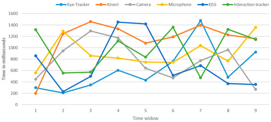 Data Acquisition and Synchronization (DAS) is a Representational State Transfer (REST; RESTful) web service that acquires real-time data from multiple data sources. After acquiring the data, synchronization is performed based on the time stamp of the device and queued based on the event for identification of the context. In the UX domain, every event is linked with a timestamp and heavily depends on the context [62]. All attached devices and sensors send data independently (they each have an independent clock); thus, a logical clock is needed to synchronize all attached devices to the Lean UX platform. Therefore, a synchronization mechanism based on a time frame—the so-called “complete and incomplete sync” [64]—is implemented. The details of the implemented algorithm are presented in [64]; it was developed using the Node.JS platform [64,66] to more efficiently handle events and non-blocking communication. After synchronization, each received data packet is labeled according to the data nature.
