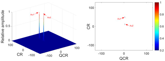 According to [17], we can see that the optimal choice of L lags are . Thus, the optimal scale factors of 2D-PMPCRD are . However, in Section 3.1, we can see that the cross-terms form spurious peaks if the scale factors are set as the same. The spurious peaks influence the detection of the true peaks. To solve this problem, the simple method is to use different scale factors. Thus, the scale factors are usually selected as different ones in realistic application. Considering the accuracy of CR and QCR estimation, the sub-optimal scale factors should be selected around the optimal one [17].