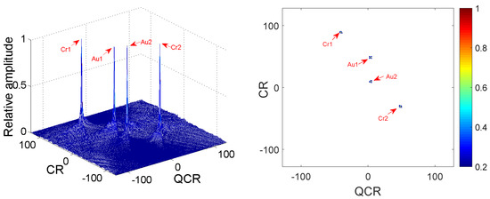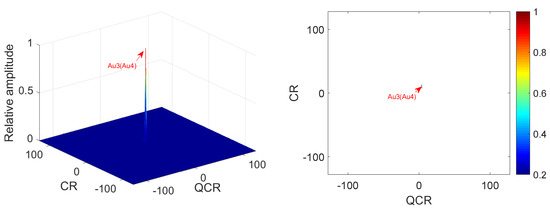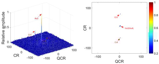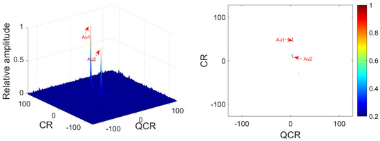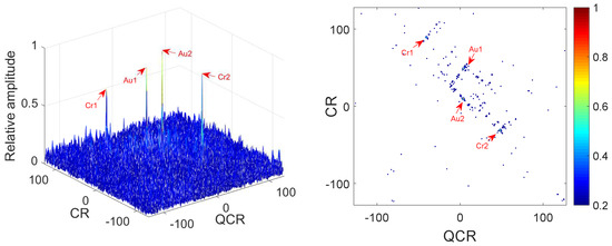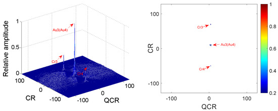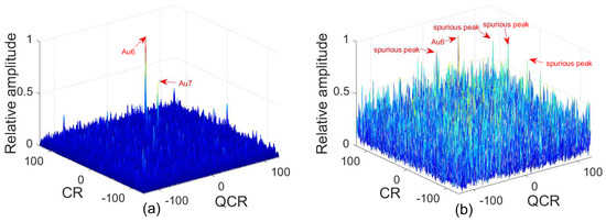 In Figure 5 and Figure 6, Cr3, Cr4 and Au3, Au4 denote the spurious peaks and the true peaks. From Figure 6, we can see that two spurious peaks appear on the CR-QCR domain, which will influence the detection of the true peak. Thus, MLVD can not be used under this condition. From the analysis of Equation (22), we can see that the true peaks will appear on the same position on the CR-QCR domain when the multi-QFM signals have the same QCR and CR. From Figure 6, we can see that the simulation results have proven the theoretical analysis.