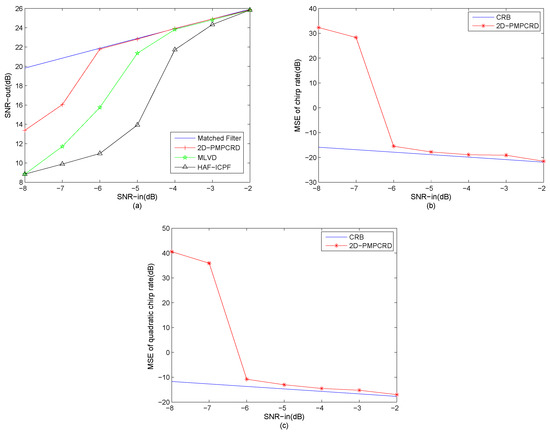 One QFM signal that denotes is considered. The sampling frequency is set as 256 Hz. The signal length N and effective signal length are set as 624 and 512. Parameters for are set as follows: , , , . The set of scale factors are set to , . The constant delay h is set to 2 s. The test input SNRs in figures are SNR = [−8:1:−2]. In this example, 100 simulations are run for each SNR value. The input–output SNR [21] is used as a measurement and the result is shown in Figure 5a. The observed mean square error (MSE) and the Cramer–Rao Lower Bound (CRLB) of quadratic chirp rate and chirp rate in different SNRs are shown in Figure 5b,c, respectively.