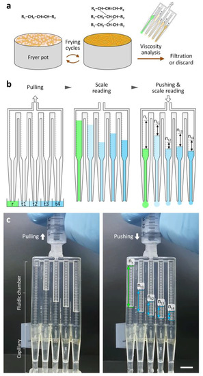 - Liu, M.; Xie, S.; Ge, J.; Xu, Z.; Wu, Z.; Ru, C.; Luo, J.; Sun, Y. Microfluidic Assessment of Frying Oil Degradation. Sci. Rep. 2016, 6, 27970. [Google Scholar] [CrossRef] [PubMed]