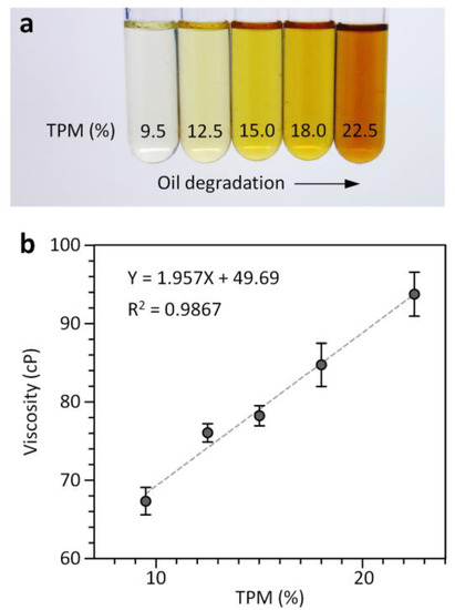 - Osawa, C.C.; Gonçalves, L.A.G.; Gumerato, H.F.; Mendes, F.M. Study of the effectiveness of quick tests based on physical properties for the evaluation of used frying oil. Food Control 2012, 26, 525–530. [Google Scholar] [CrossRef]