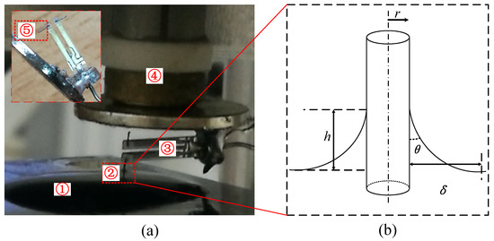 A meniscus, shown in Figure 1, is formed at the probe–liquid–air interface due to the tension of the liquid surface tension, which will exert a capillary force on the probe. To obtain the best signal-to-noise ratio for the FM-AFM, the vibration amplitude of the QTF should be no more than and the maximum vibration amplitude, where atomic resolution is obtained, is in pure water [23] (QTF’s ultrahigh stiffness ensures that it can produce stable small amplitude vibrations in the air and the liquid). Therefore, the mechanical behavior of the meniscus can be seen as a mechanical oscillator with a spring constant and a damping coefficient . The properties of the meniscus have been studied by mechanical behavior of a fiber in the liquid environment, and its spring constant can be expressed as [24]: