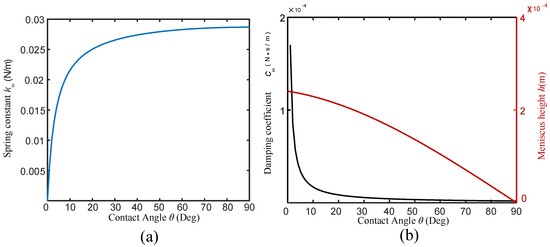 The influence of meniscus on the BT-QTF: (a) relation between equivalent spring constant of meniscus on tungsten probe and contact angle, (b) relation between the damping coefficient or the meniscus height and the contact angle.