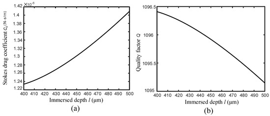 (a) relation between the Stokes drag coefficient and the probe immersed depth l in the liquid, (b) relation between the Q-factor and the probe immersed depth l in the liquid.