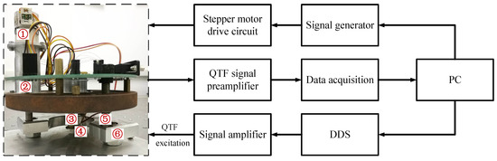Schematic of the frequency spectrum measurement system for BT-QTF, ① stepper motor, ② transmission device, ③ piezoelectric tube scanner, ④ BT-QTF, ⑤ high-precision screw thread pair, ⑥ support base.