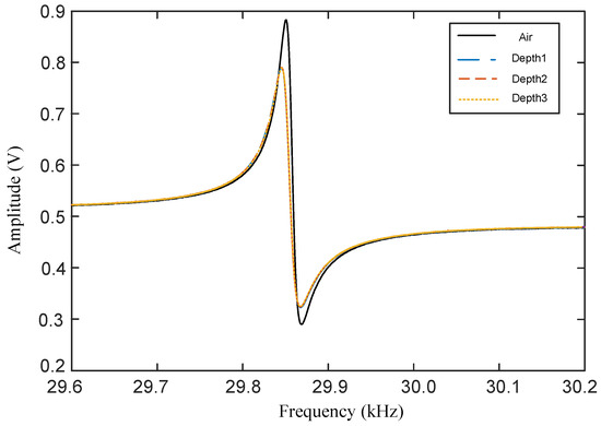 Amplitude-frequency characteristics of the BT-QTF in the air and the probe immersed in pure water with different depths (). The BT-QTF’s resonance frequency in the air is .