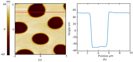 (a) topography of the circular microgrid sample imaged by BT-QTF in the liquid; (b) the image of the line cross section.