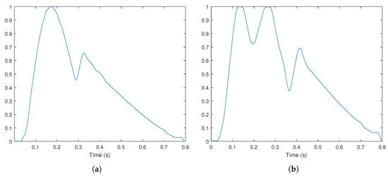 Testing of the developed system was done using the waveforms in Figure 1. These signals are representations of arterial pulse, obtained from a waveform generator [30], and were chosen due to being two reference pulses that should be easily distinguished: normal and bifid pulse. The typical pulse waveform is characterized by a systolic pressure of 120 mmHg, a diastolic pressure of 80 mmHg and a rate of around 75 beats per minute [31].