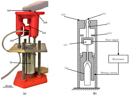 Depictions of the tested prototype: (a) photograph and (b) diagram, where: (i) solenoid; (ii) force sensor; (iii) finger rest; (iv) end effector; (v) bearing; (vi) range limiter.