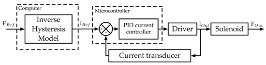 While the use of a fully open-loop, voltage controlled system would be ideal from an ease of implementation standpoint, initial testing revealed it to be too unreliable and unable to produce repeatable results. By switching to closed loop current control, these aspects were improved. The only major problem presented by the system was one of actuator hysteresis in the force output. As will be further detailed in Section 3, this was countered by using a control approach consisting of closed loop current control with hysteresis compensation, as depicted in the diagram of Figure 3.