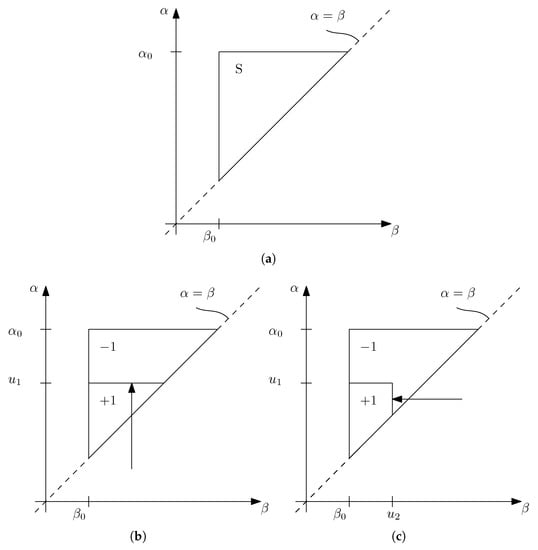Preisach plane. (a) Definition of the Preisach plane; (b) Variation of Preisach plane values when the input is increased; (c) Variation of Preisach plane values when the input is decreased.