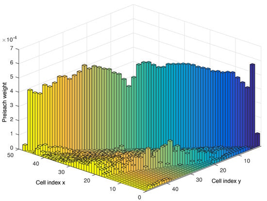 Using this data and the procedure described in the previous section, through the algorithms detailed in [41], the Preisach density function and bulk contributions for this system were obtained, producing a model with a discretization level of 48. The obtained Preisach weights for each cell of the discretized plane, are depicted in Figure 7.
